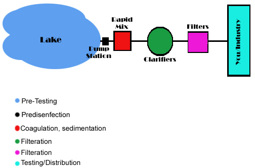 Testing begins before reaching the treatment facility. The dirtier the water, the easier it is to disinfect and treat according to our operations tour guide at the plant. Samples are taken of the lake water and sent over to the lab for testing. Water is pumped from the water source through the pump station where chlorine dioxide is added. It is then pumped through the rapid mix where various chemicals such as lime, polymer, chlorine, ammonia and alum are added. |